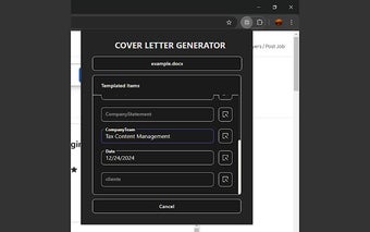 カバーレター生成ツールは、求人応募のためのカスタマイズされたカバーレターを作成するプロセスを簡素化するために設計された無料のChromeアドオンです。ユーザーがテンプレートをアップロードし、現在のブラウジングセッションから関連情報で自動的に埋め込むことを可能にすることで、パーソナライズされたカバーレターを書くために費やす時間と労力を大幅に削減します。ユーザーは、独自の構文を使用してテンプレート内の特定のテキストを簡単に指定でき、すべての必要な詳細が手間なく含まれることを保証します。